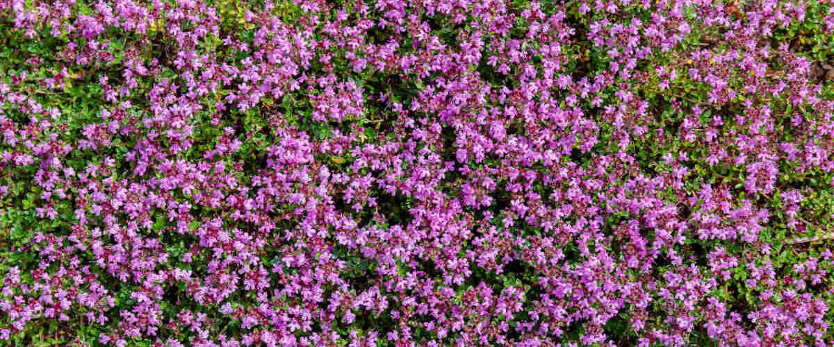 Puzavi timijan (Thymus serpyllum) proizvodi male listove koji stvaraju gusti pokrivač, delujući kao živi malč.