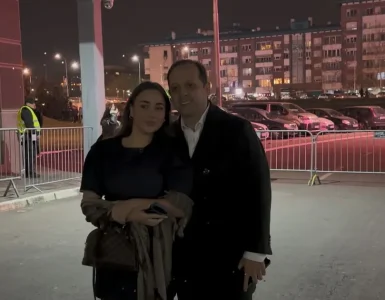 Njen suprug koji je od skoro i njen menadžer, stoji uz nju kao stena – u tamnoj, jednostavnoj kombinaciji, teget džemperu i tamnim pantalonama, nenametljivo, ali snažno prisutan.