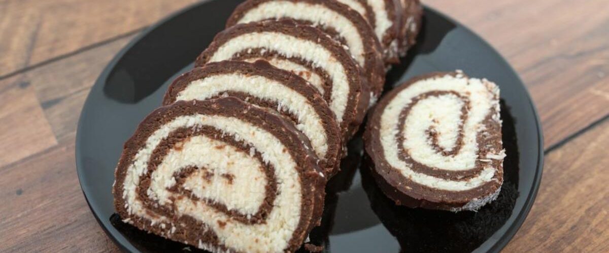 Crno-beli rolat s kokosom koji vam danas predstavljamo ne zahteva pečenje niti korišćenje šporeta, a u njemu nema jaja, mleka, ni ulja, a gotov je očas posla!