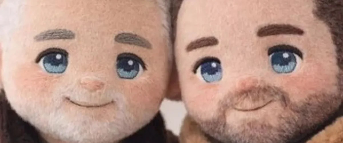 Na fotografiji se vide dve lutkice u braon i bež tonovima – jedna sa prepoznatljivom Čedinom sedom kosom, a druga sa bradom karakterističnom za Aleksandra.