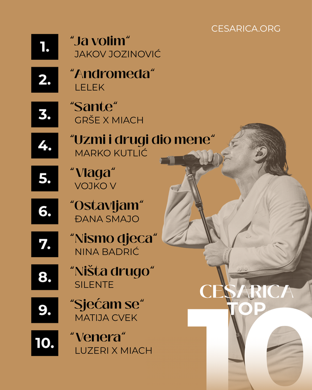 Glazbena nagrada Cesarica, koja već godinama prati i nagrađuje najuspješnije domaće pjesme, autore i izvođače, ulazi u novu fazu razvoja i odmah donosi prve naznake kako će izgledati utrka za Hit 2026. godine! Kroz osvježeni model praćenja uspješnosti pjesama, objavljen je prvi Cesarica Top 10 za razdoblje od siječnja do ožujka, koji otkriva koje su pjesme obilježile početak godine – ali i koje su već sada u ozbiljnoj konkurenciji za najveći hit 2026.