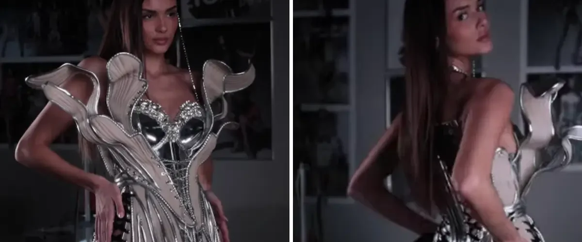 U dinamičnom videu, snimljenom u prigušenoj atmosferi koja podsjeća na umjetnički atelje, Laura predstavlja haljinu koja je pravo malo remek-djelo. Riječ je o skulpturalnoj korzet-haljini koja spaja futurističke elemente s prepoznatljivom Zigmanovom estetikom. Metalik srebrni detalji isprepliću se s bež podlogom i kristalnim ukrasima, stvarajući dojam modernog oklopa koji istovremeno odiše snagom i ženstvenošću. Svaki kut kreacije otkriva nove, zamršene detalje, od precizno izrađenog korzeta do valovitih, trodimenzionalnih ukrasa koji prkose gravitaciji.