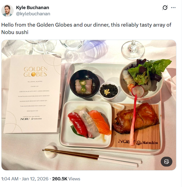 Gosti Zlatnih globusa dobili su jela koja potpisuje legendarni chef Nobu Matsuhisa. Fotografiju jelovnika podijelio je Kyle Buchanan iz New York Timesa na društvenoj mreži X, što je potaknulo burnu raspravu na toj mreži. Gostima je bio poslužen kavijar, salata od jastoga, crni bakalar, sushi…