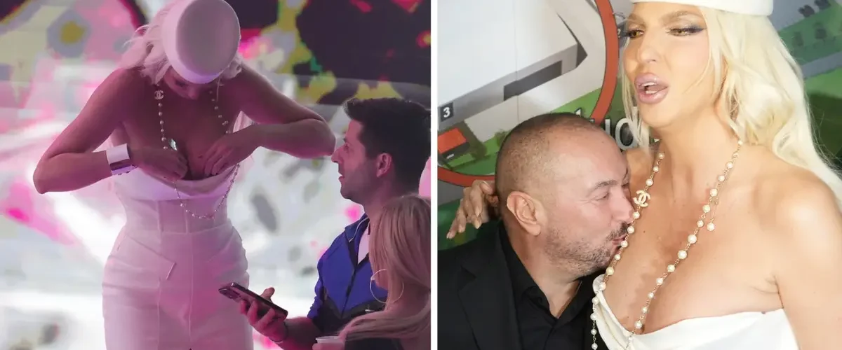Jelena Karleuša stigla je na snimanje novogodišnje emisije u uskoj bijeloj haljini s velikim dekolteom. Srpski narodni pjevač Radiša Trajković Đani ljubio ju je po dekolteu