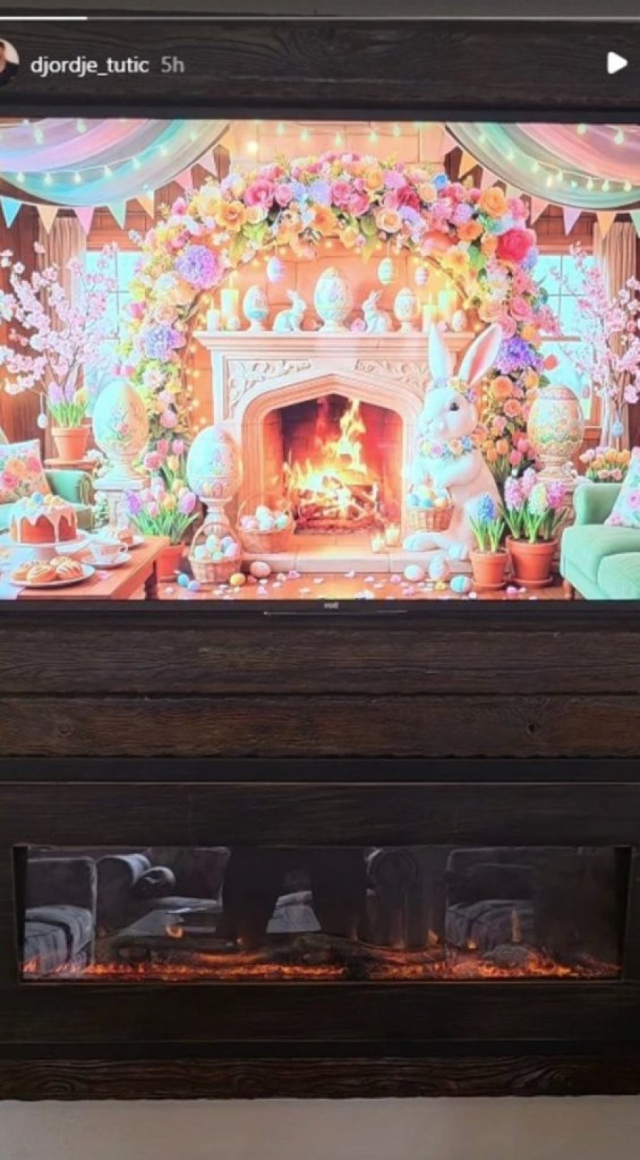 On je na društvenim mrežama podelio deo prazničnog ugođaja iz njihove vile, gde se vidi topla atmosfera u dnevnoj sobi. U prostoru je pokrenut kamin, dok se na velikom ekranu smenjuju motivi Vaskrsa – od uskršnjeg zeca do šarenih jaja, što je dodatno unelo praznični duh u dom.