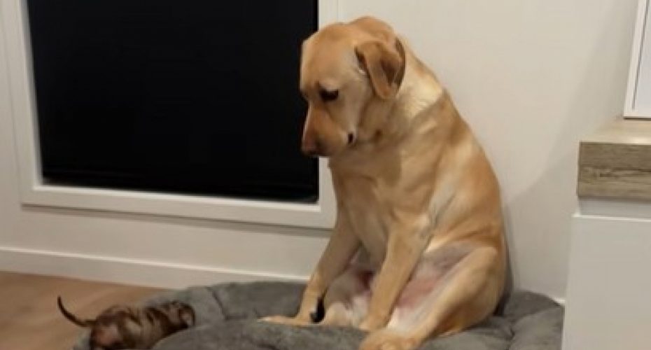 Korisnica TikToka, Kejt Tejlor, objavila je video u kojem se vidi njen labrador kako sedi na krevetu i nemo posmatra štenad koja mu se približavaju.