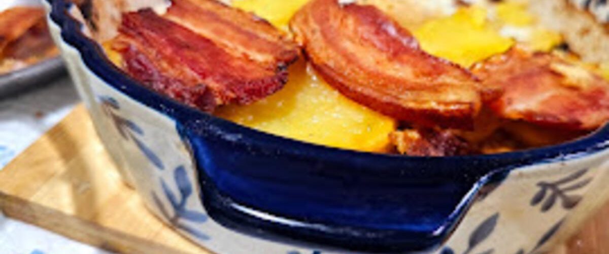 Vratite pleh u rernu i nastavite pečenje dok krompir ne postane mekan, a slanina hrskava i lepo zapečena.