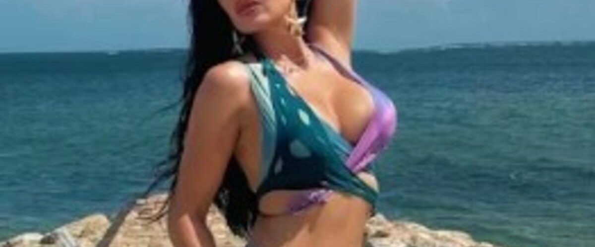 Njen dekolte je elegantno istaknut i vrlo skladan, bez preterivanja. Kupaći kostim sa ukrštenim detaljima naglašava prirodnu liniju grudi, dok kroj daje dozu sofisticirane ženstvenosti, a ne vulgarnosti.