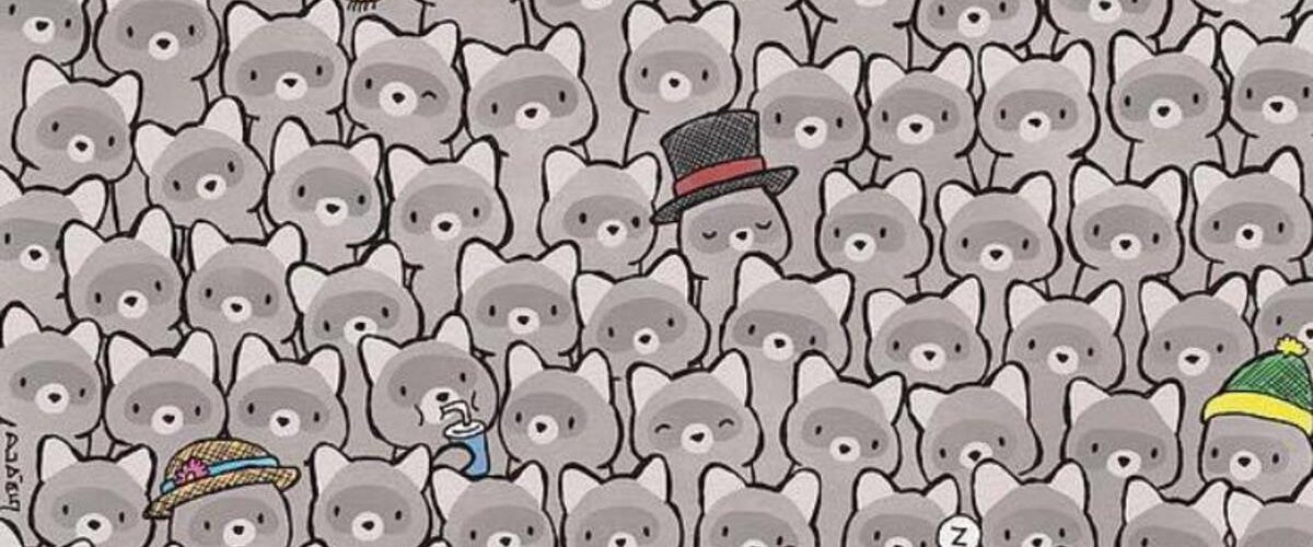 Rakuni i mačka na ovoj slici dele istu boju krzna i oblik tela. Međutim, đavo je u detaljima. Dok rakuni imaju svoje prepoznatljive tamne maske oko očiju, mačka ih nema. Njeno lice je čisto sivo. Fokusirajte se na tu malu razliku i pokušajte da skenirate sliku ne gledajući celinu, već pojedinačne redove.