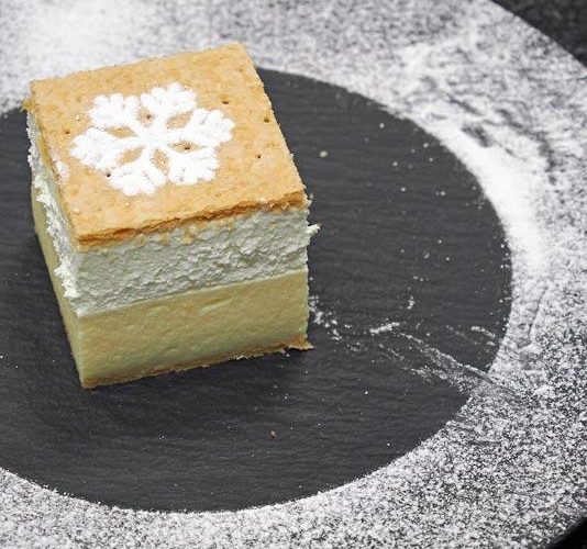 Kad su svi delovi gotovi, počnite sa slaganjem slojeva – na lisnato testo stavite žuti krem, zatim beli šlag i na kraju pokrijte kolač drugim slojem lisnatog testa.