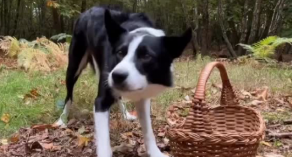 Simpatičan pas je u šumi skupljao kestene i stavljao ih u korpu. Čuje se glas njegove vlasnice kako ga hvali.