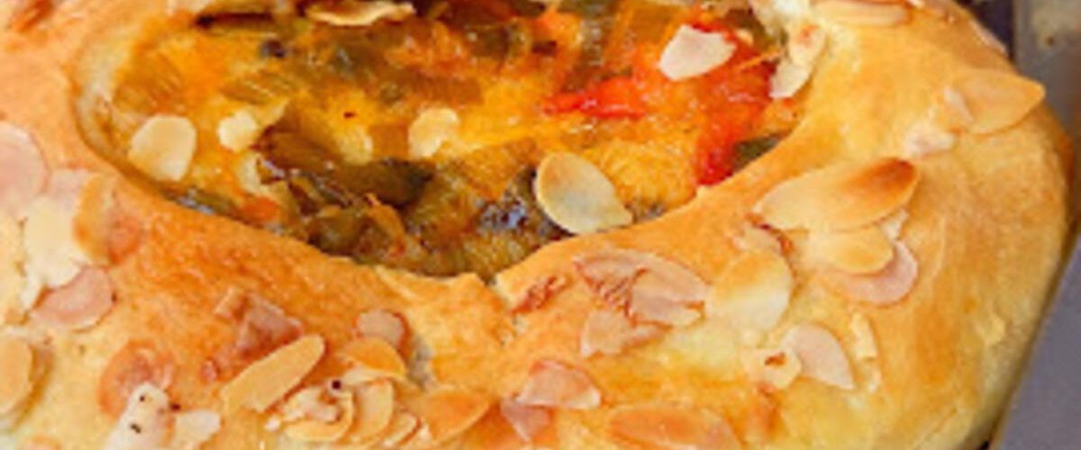 500 ml vode, 20 g kvasca, 1 kašičica šećera, 1 kašičica soli, 800 g brašna, 1 ljuta paprika, 1 praziluk, 1 paradajz, 1 kašika griza, začin, 100 g sira, 1 jaje, ulje, bademove ljuskice, kačkavalj, 1 kašika mleka