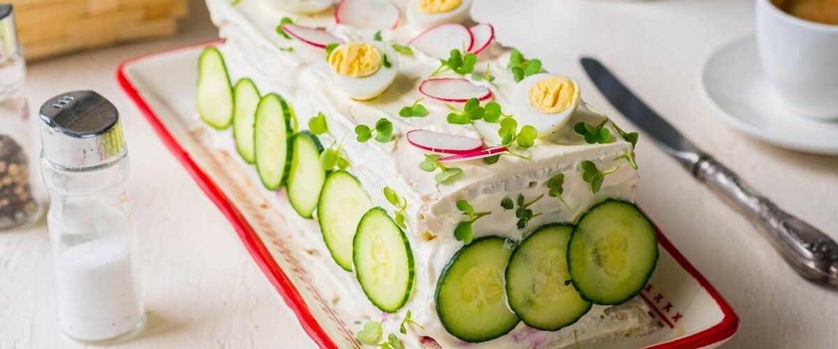 Onda idu žumanca iz jaja koja ste skuvali. Preko njih sloj majoneza, pa tvrđi sir i odozgo takođe narendana belanca. Tortu ukrasite s krugovima svežih krastavaca, ohladite u frižideru i sladite se.