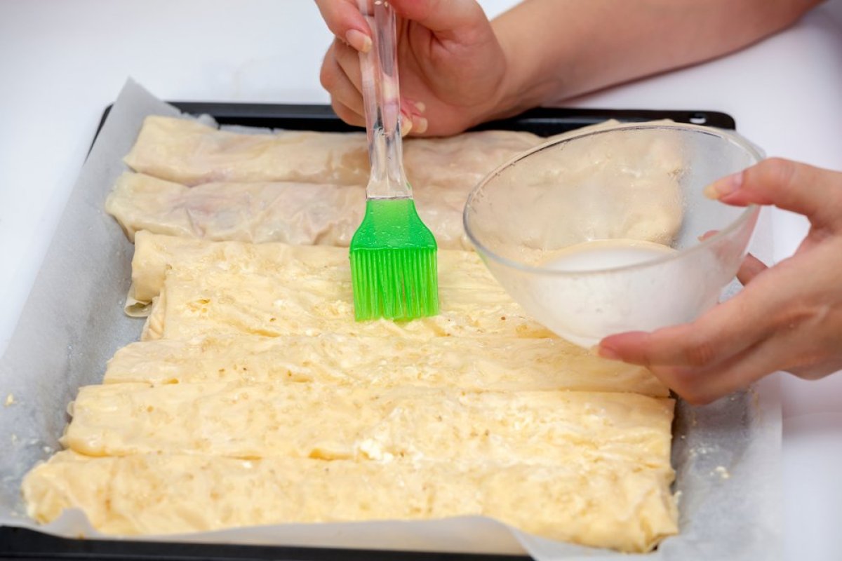 Testo se zamesi, podeli na četiri dela i ostavi da odmori. Svaki deo se najpre razvuče oklagijom, a zatim rukama dok ne postane sasvim tanak. Kora se preklapa ka sredini, blago poulji, filuje i pažljivo zatvara. Postupak se ponavlja sa svim korama, koje se potom ređaju u pleh i peku do zlatne boje.