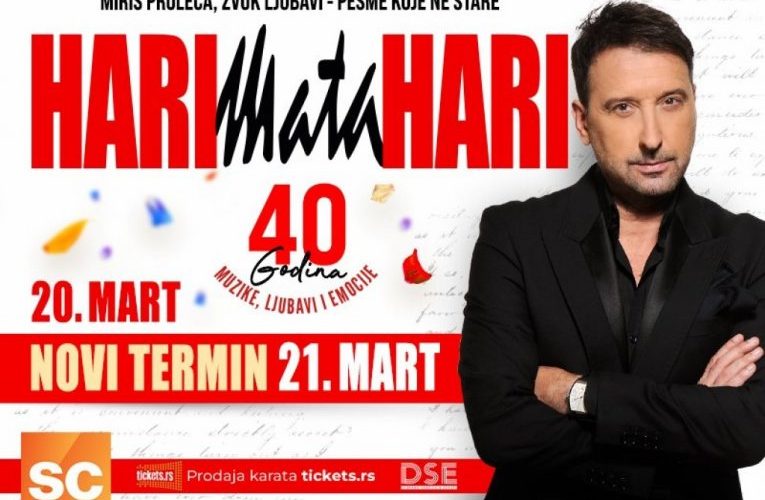 Regionalna pop zvezda Hari Mata Hari vraća se pred beogradsku publiku u okviru turneje kojom obeležava veliki jubilej 40 godina trajanja na muzičkoj sceni, čime će ovdašnju publiku obradovati pesmama koje ne stare i koje i dan danas pevaju sve generacije.  Tako će poznati pevač  svojim obožavaocima  prirediti dve večeri za pamćenje, 20. i 21. marta u Sava Centru, a  ulaznice za drugi datum su već u prodaji na tickets.rs.