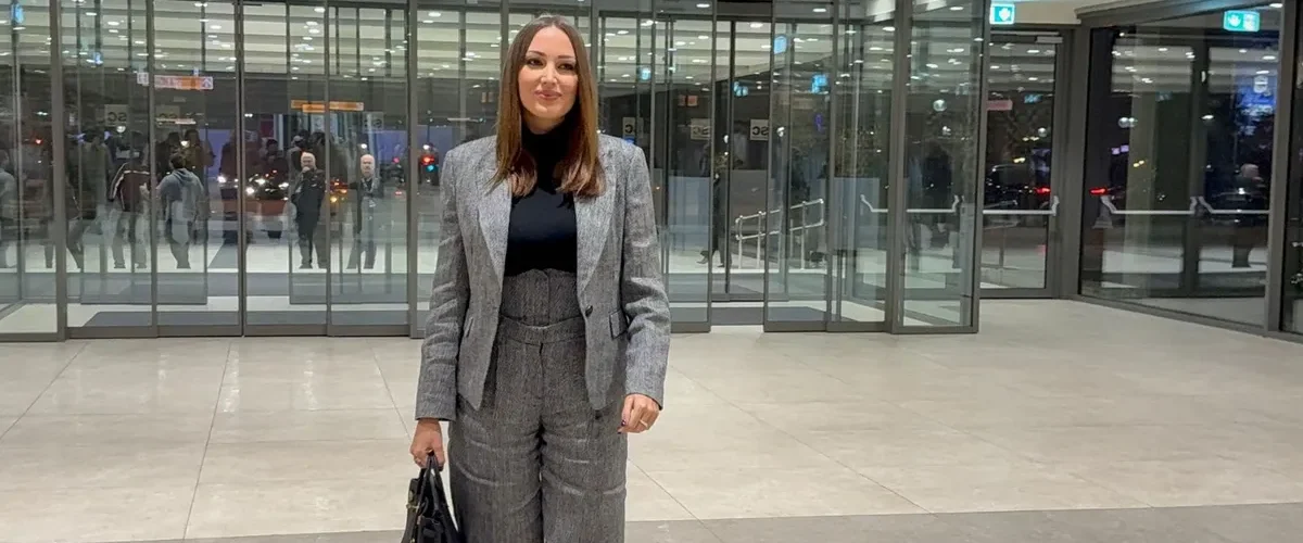 Aleksandra je nosila duboke sive pantalone, sako, rolku i štikle, izgledajući toliko prefinjeno da su se mnogi okretali za njom.