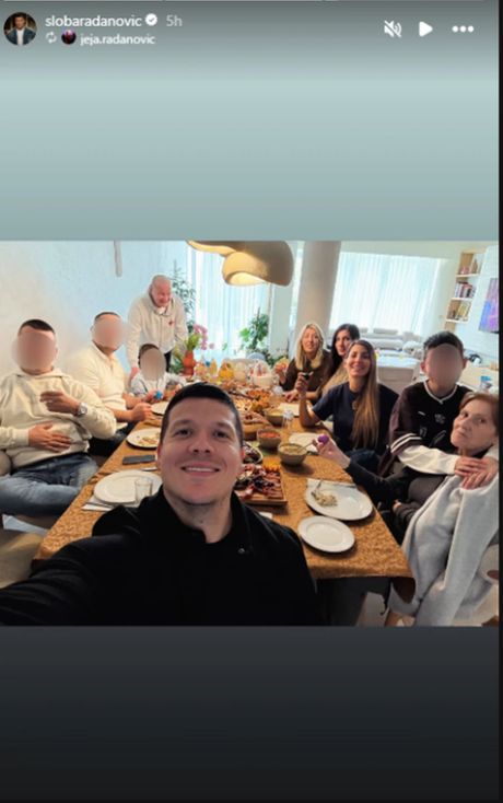U prvom planu je Sloba koji pravi selfi, dok za stolom sede članovi porodice – među njima su Jelenini roditelji i sestra, kao i Slobina majka Draginja. Sto je bogato postavljen raznovrsnim jelima, a u centru su i tradicionalna uskršnja jaja, koja dodatno naglašavaju praznični duh.