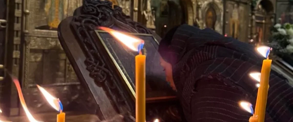Na snimku se vidi kako Sloboda nosi maramu na glavi, ljubi ikonu i zapali sveću, u mirnom i svečanom trenutku molitve.