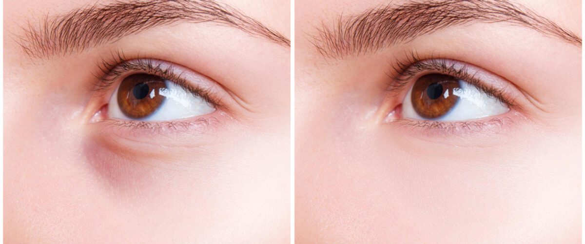 Predeo oko oka pre i posle šminkanja ciljanog na neutralisanje i prekrivanje podočnjaka i tamnih kolutova