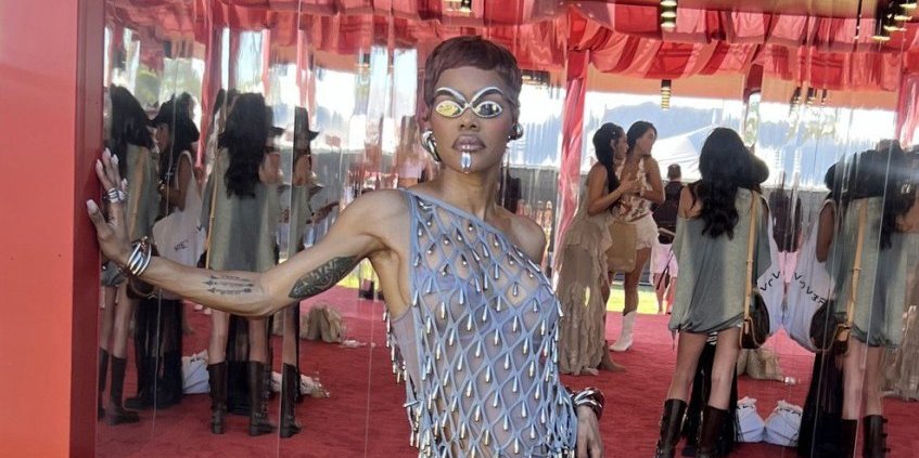 “Gola” haljina koju je ponela je zapravo bila kombinacija bodija podignutog visoko iznad kukova i metalne mreže koju je nosila preko njega. Cela kreacija bila je dodatno ukrašena srebrnim detaljima koji su podsećali na kapljice vode, što je autfitu dalo futuristički i efektan izgled.