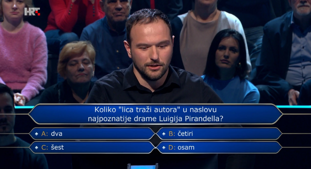 Na sljedećem pitanju odlučio je vjerovati publici, iako je imao vlastitu sumnju. Pitanje o poznatoj drami Luigi Pirandello donijelo mu je 1.000 eura, budući da je većina publike točno prepoznala odgovor – “šest”.