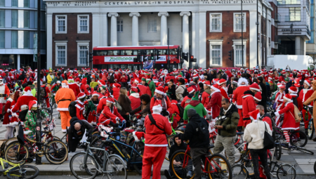 Više od 1.000 biciklista obučenih u kostim Deda Mraza vozilo se kroz centar Londona ove subote kako bi obeležili 11. godišnjicu događaja “Santa Cruise”.