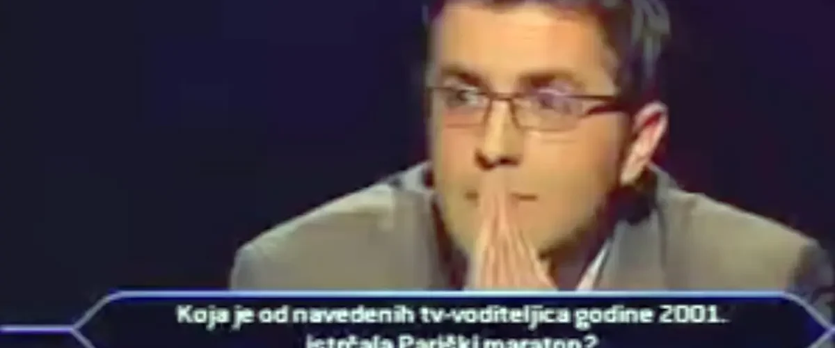 Pitanje je glasilo: ‘Koja je od navedenih TV voditeljica godine 2001. godine istrčala Pariški maraton?’. Ponuđeni odgovori bili su: Mirjana Hrga, Sandra Antolić, Mirna Zidarić i Ines Preindl.